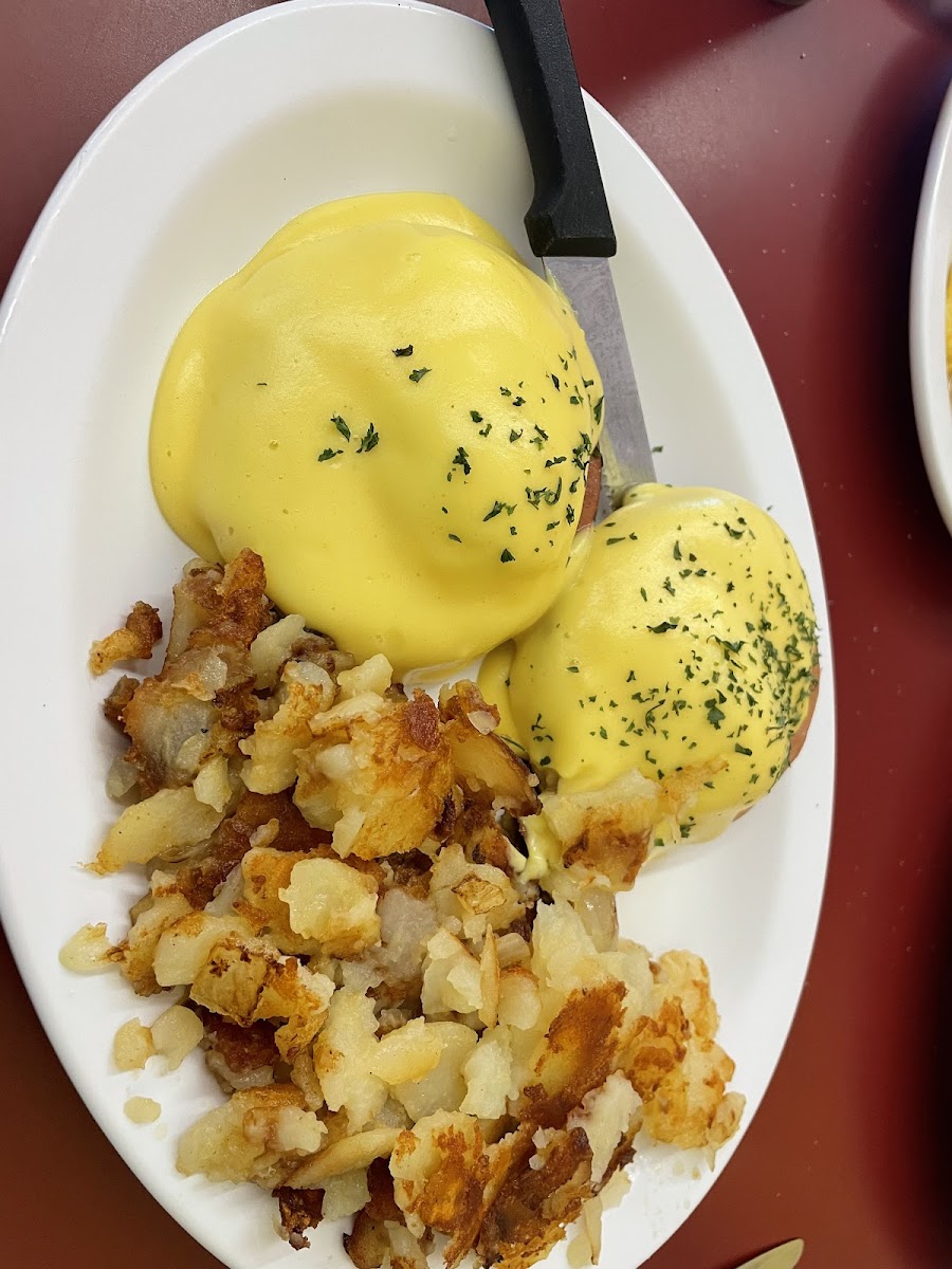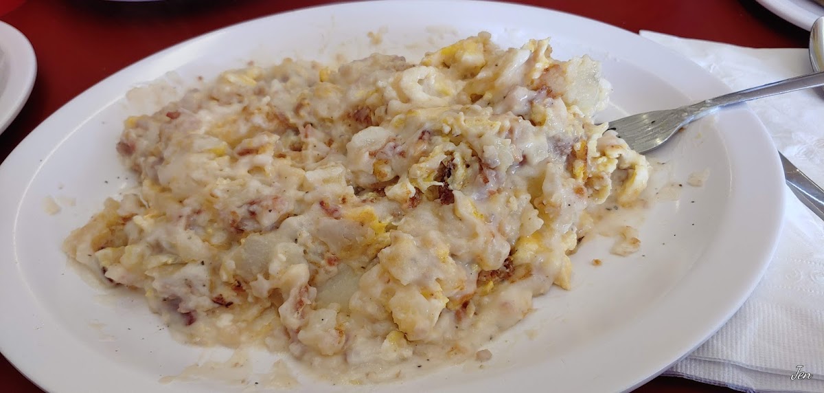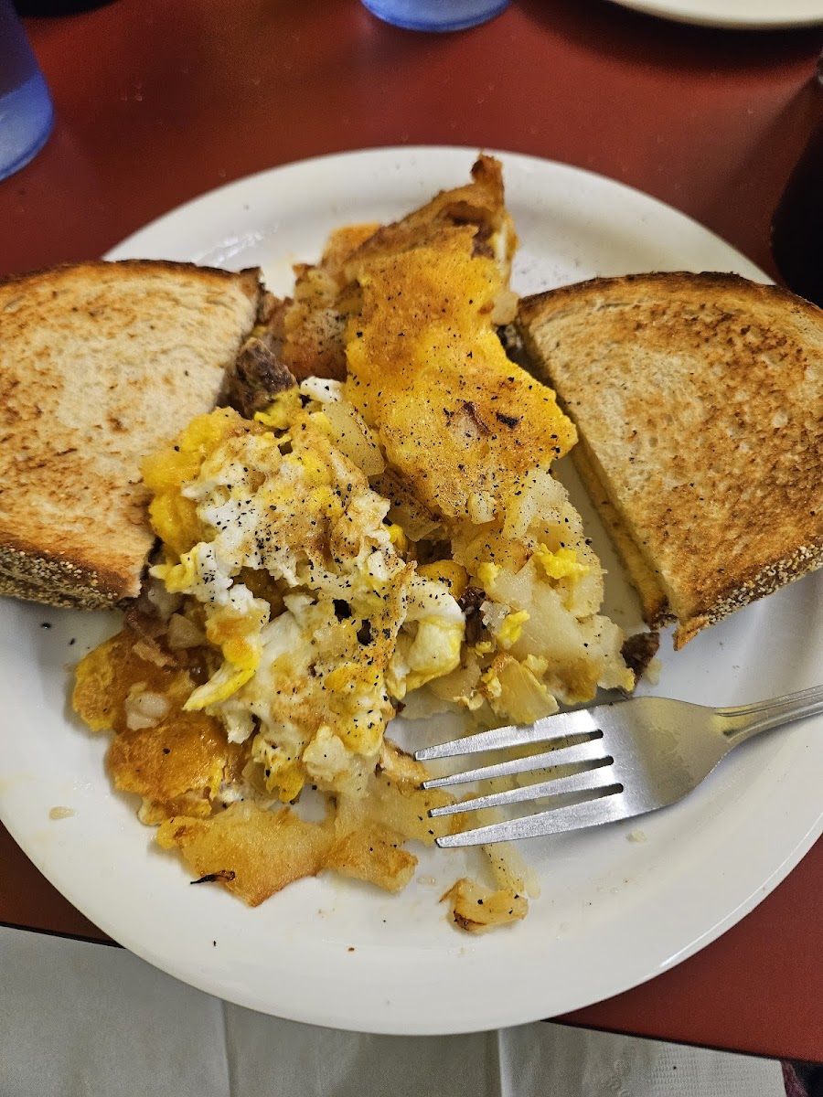 Local diner in Streetsboro. The reviews were good. It was a cozy diner with booths, tables and counter seating. I sat at the counter. Service was good. I had the Ultimate Herb Nelson with sausage gravy. It comes as the Herb Nelson with 2 eggs, home fries, chopped onion, American cheese scrambled together. The Ultimate adds bacon, sausage, ham, tomatoes, green peppers & mushrooms. I was asked if I wanted sausage gravy on top. Of course I did. It was excellent. It was a generous portion. It came with a side of toast. I really like the sourdough toast. I saw many nice items come out of the window. Waffles, pancakes, Texas French toast. Many were topped with fruit toppings. Might be what I try next time. That coffee was good also. I would recommend.