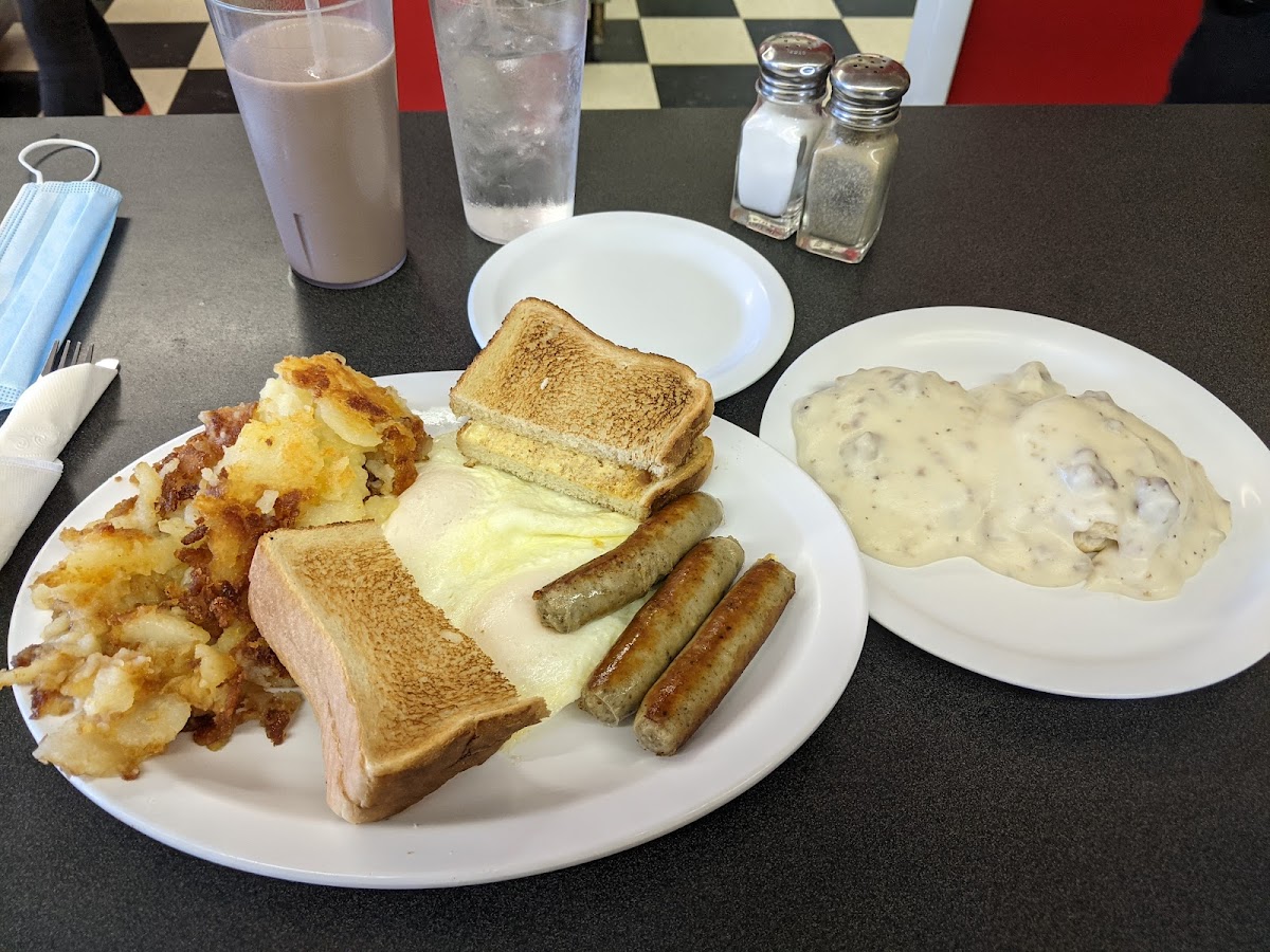Loved this little gem of a dinner! Came here with my best friend after a hike! Enjoyed some coffee, friendly staff, clean establishment ! Enjoyed the sausage gravy, I would highly recommend trying the Texas French toast with strawberries and whip!!! The chicken sandwich and fries were good as well! It’s the atmosphere and quality people we enjoyed the most! Will definitely make this diner our stop in while traveling through again!